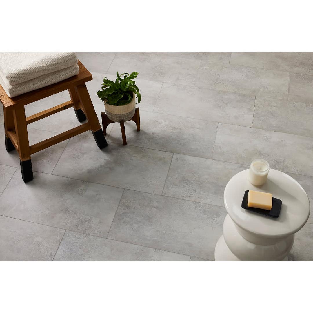 Replicate the beauty and elegance of natural stone with the affordable, easy-care Trecento Mountains Gray Beveled Luxury Vinyl Floor Tile from the Trecento Series by MSI. These 12" x 24" vinyl tiles are waterproof, scratch, stain and dent-resistant, and include an innovative 1mm pre-attached backing that offers sound protection and comfort underfoot. Each tile features a calming blend of grey and greige tones, and is coated with an exclusive PietraTech™ finish to emulate the natural texture of the modern rugged concrete that inspired its design. This tile is suitable for any grade level and multiple applications, and features a patented locking system for maximum efficiency during installation.